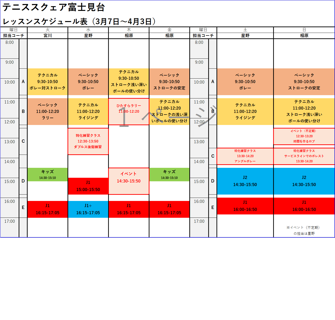 | J1 | 小学生でテニスをやってみたいお子様。 ミニコート(サービスボックス内)でのラリーや楽しく動きながらテニスの基礎を学びます。 |