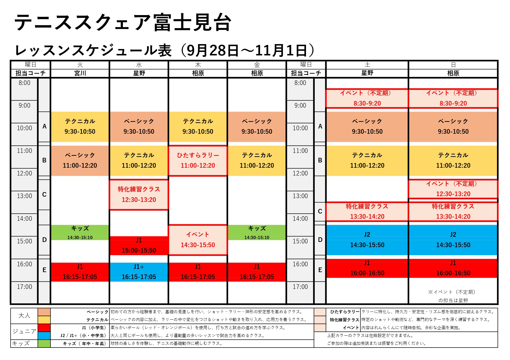 初級 | 基本的なフォームからラリーの仕方までを丁寧にレッスン致します。 | 80分 | 10名 | 平日:10,890円 土日:13,310円 |