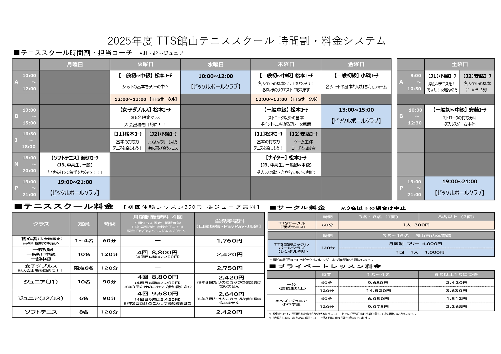 テニススクール料金(初回体験レッスン550円 ※ジュニア無料)