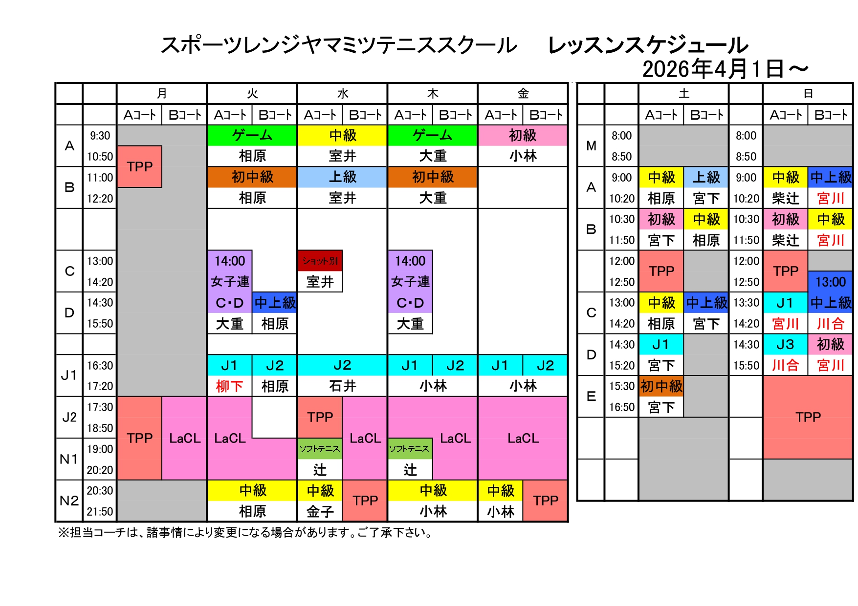 | 初中級 | ストロークで多少ラリーが出来る方、雁行陣で多少試合が出来る方。 | 80分 | ・平日 10,890円 ・ナイター・土日 12,100円 |