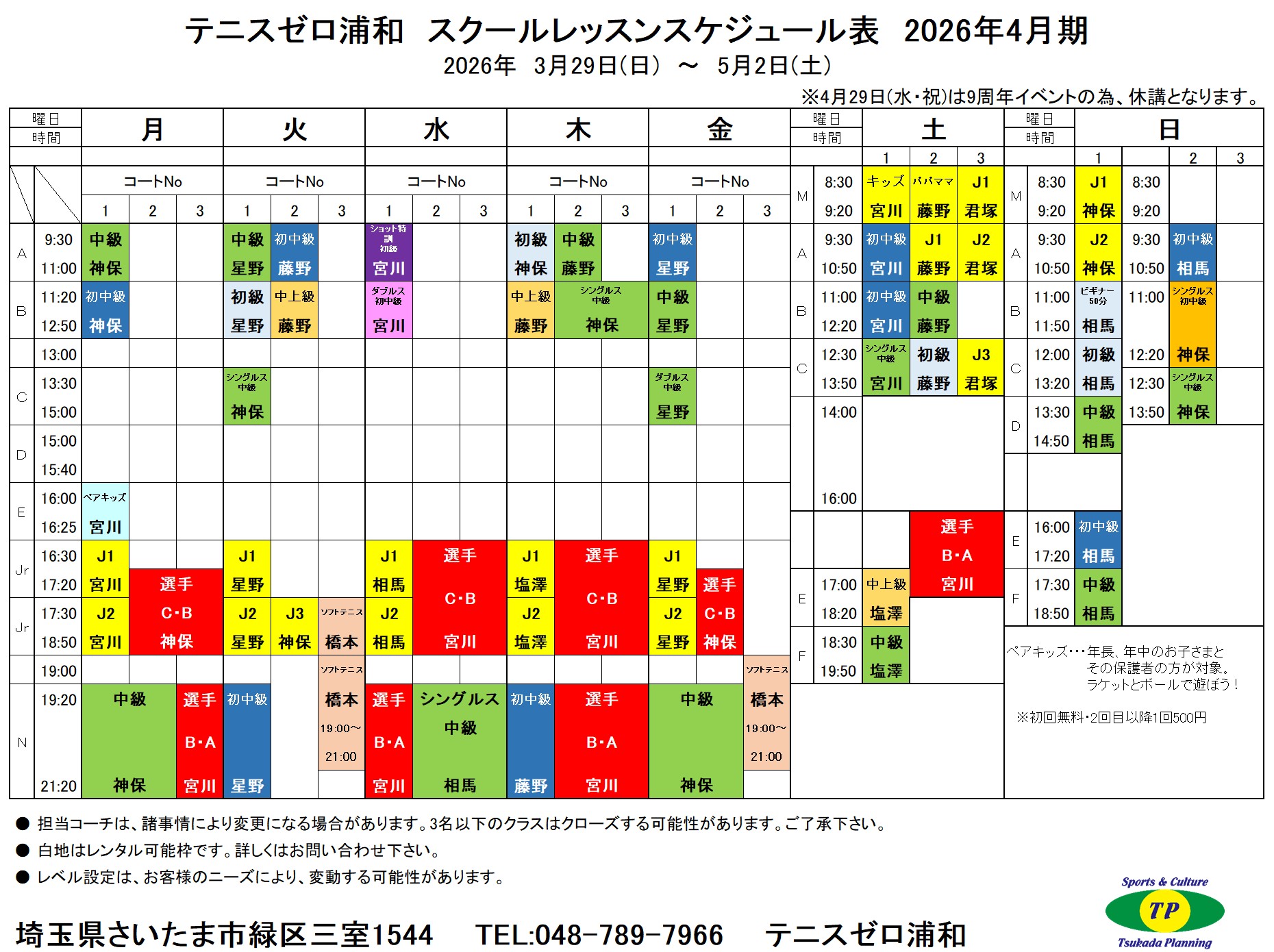 | 営業時間 | 月曜日~金曜日 9:00~21:30 土曜日 8:00~20:00 日曜日 8:00~19:00 *年末年始やイベントウィークは通常レッスンはお休みとなります。 テニスゼロ浦和レッスンカレンダーをご確認ください。 |
