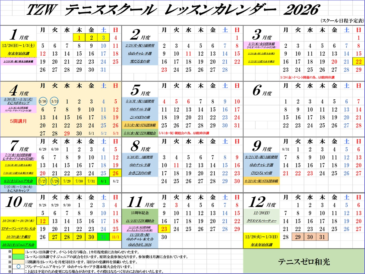 ※クラブ&スクールカレンダーでのイベントウィーク(年末年始・春・夏・秋)及び月例大会等で、全面コートを使用する場合がございますのでご了承ください。(2ヶ月前迄にお知らせいたします)