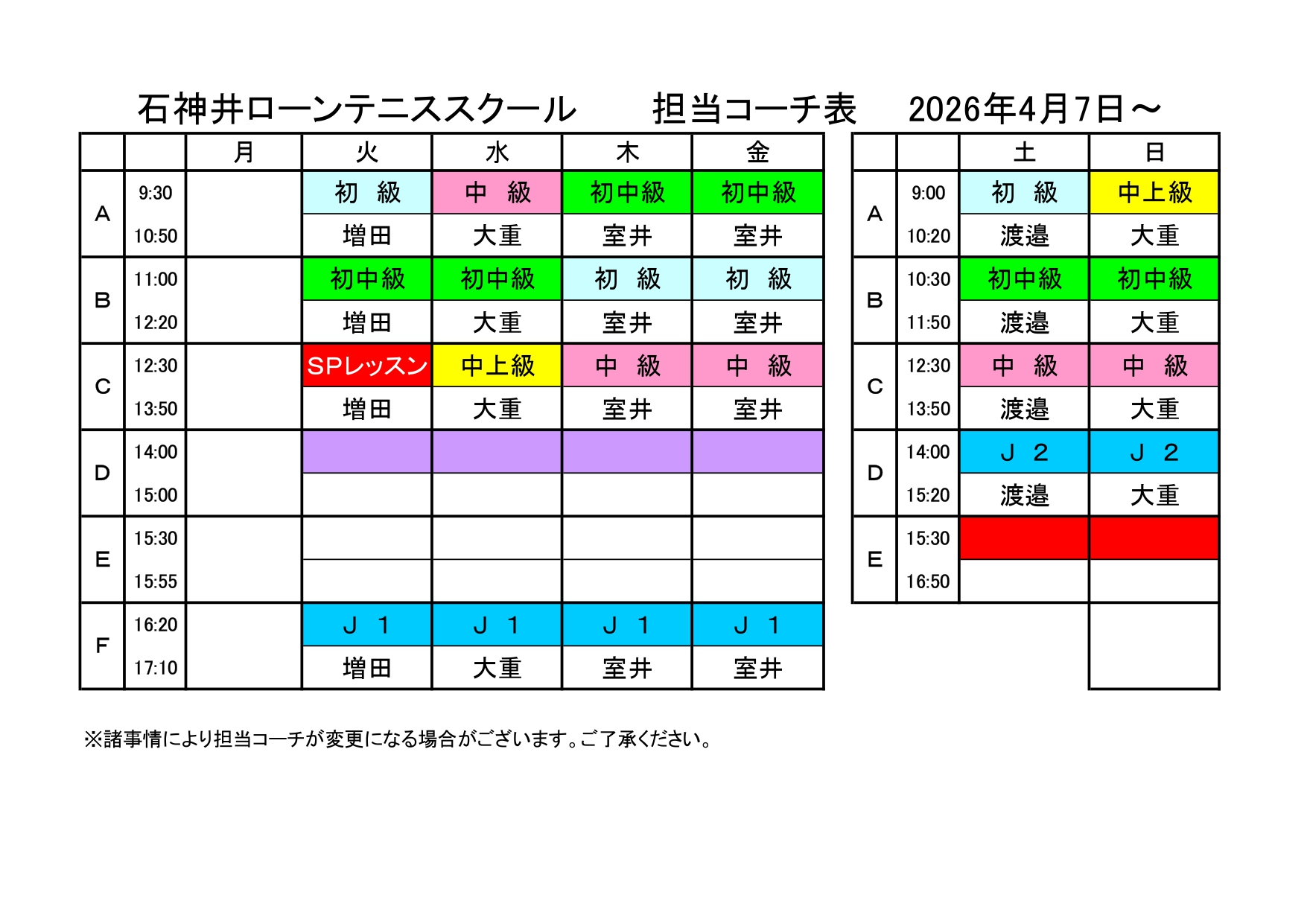 | J1 | 打ち方の基本を覚え、ミニコートでラリーが出来るようになる事が目標。 | 50分 | 7,150円 |