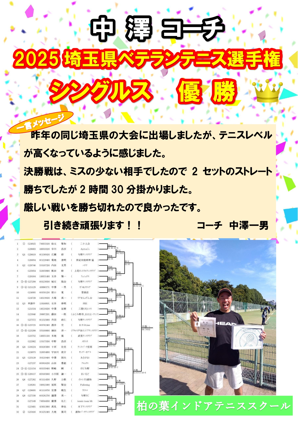 中澤コーチが埼玉県ベテランシングルス優勝しました!